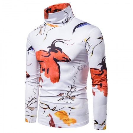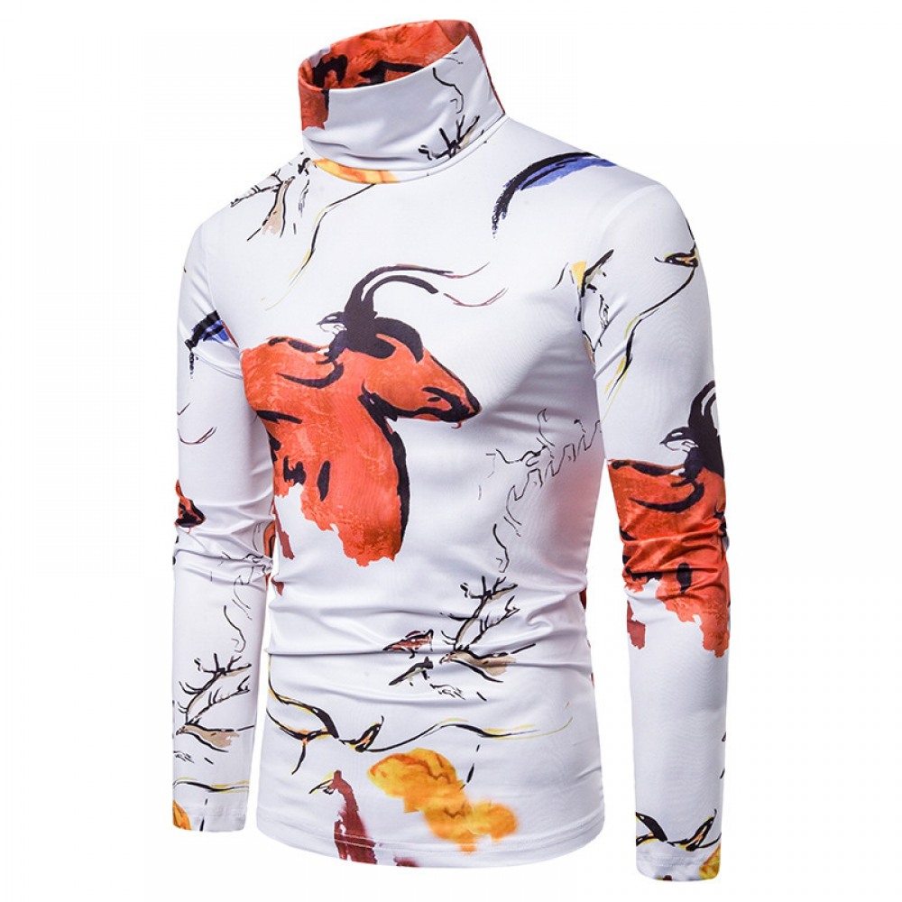 New Men's Large Size 3D Animal Ink Print High Neck Long Sleeve T-Shirt Bottoming Shirt
